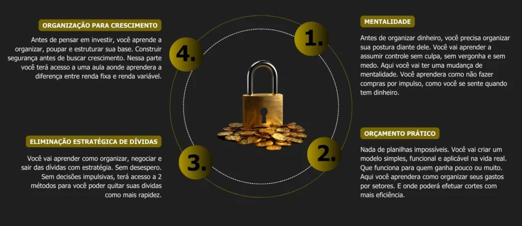 O foco principal é organização e base financeira. Você aprende quando é o momento adequado de começar a investir, mas antes constrói estabilidade, reserva e controle, evitando o erro de investir sem estrutura.